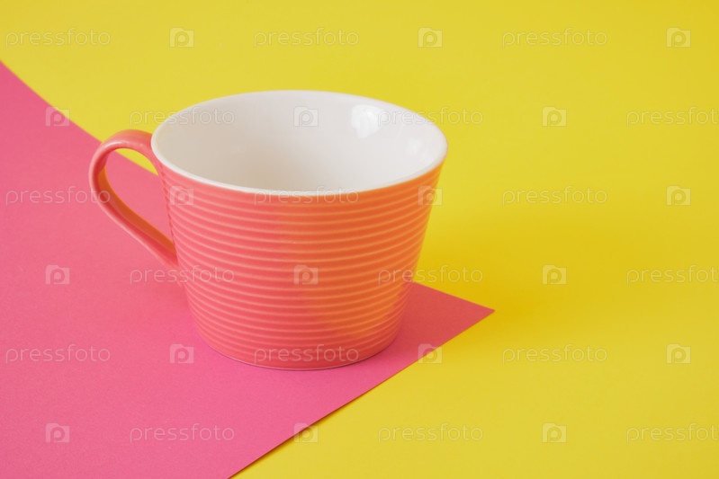Пустой макет розовой кружки на желто-розовом фоне копией пространства