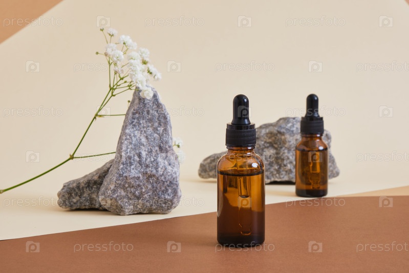 Две янтарные стеклянные бутылки с пипеткой, цветами и камнями на бежево-коричневом фоне органическая косметическая концепция, сыворотка или масло для ухода за кожей