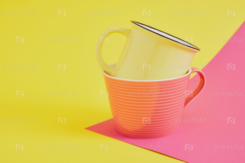 Желтые и розовые чашки, две кружки на цветном фоне, копия пространства, креативный макет