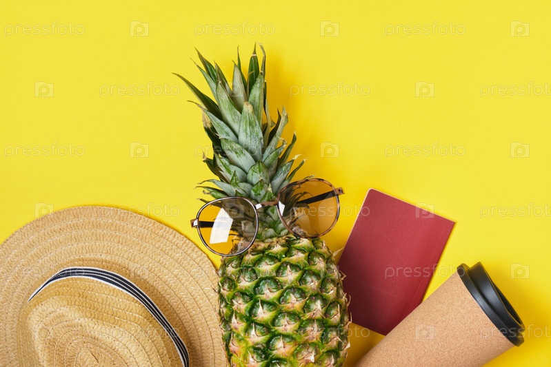 Термочашка, ананас, шляпа, солнцезащитные очки и заграничный паспорт на желтом фоне концепция отпуска в тропиках
