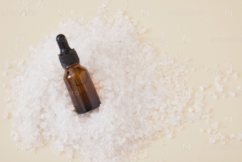 Стеклянная бутылка-капельница и ароматическая морская соль на бежевом фоне. Скопируйте пространство Капля масла и морская соль для ванны
