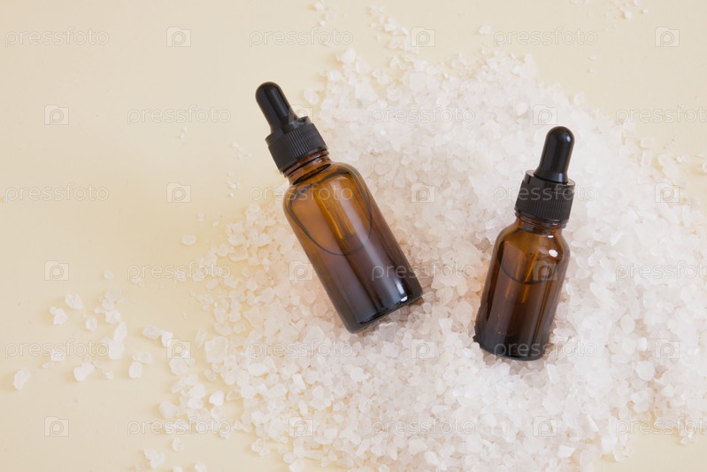 Стеклянные бутылки-капельницы с натуральной органической масляной эссенцией, сывороткой, коллагеном и ароматической морской солью на бежевом фоне. Скопируйте пространство Капля масла и морская соль для ванны