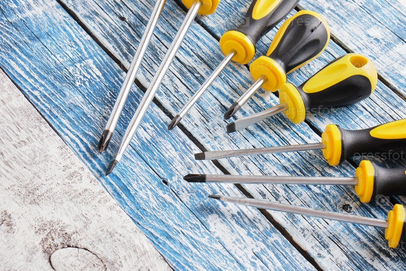 Набор отверток на деревянном фоне, вид сверху, копия пространства