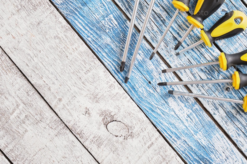 Набор отверток на деревянном фоне, вид сверху, копия пространства