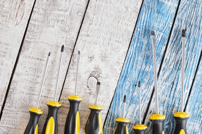 Набор отверток на деревянном фоне, вид сверху, копия пространства