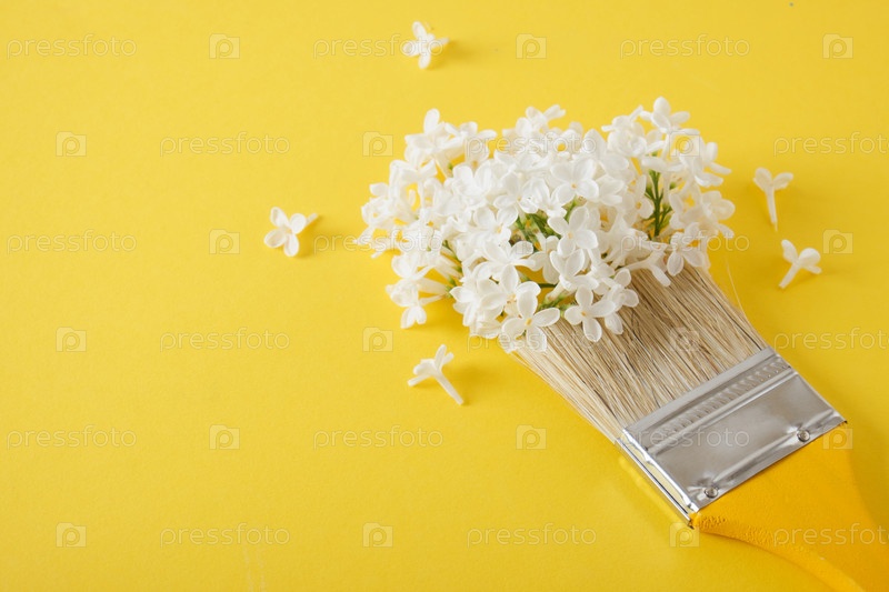 Деревянные желтые кисти и белые цветы сирени на желтом фоне