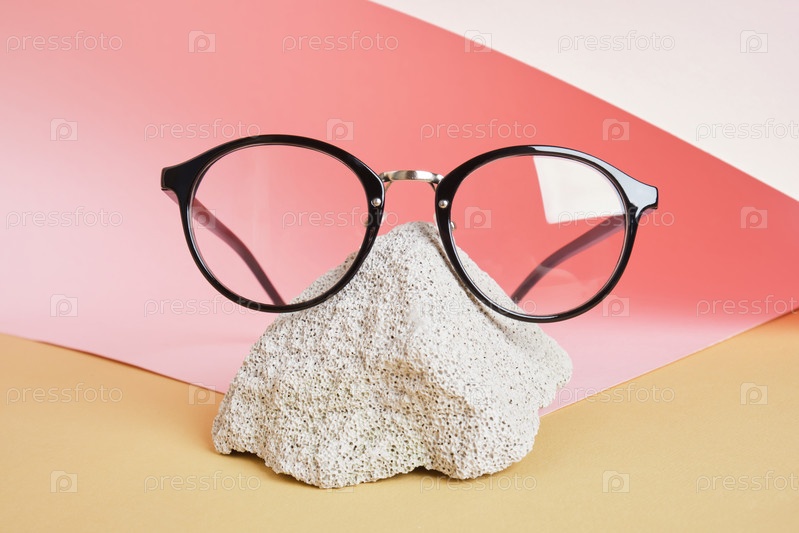 Очки на бетонном подиуме на розовом и бежевом фоне, трендовая композиция, черные стильные очки,