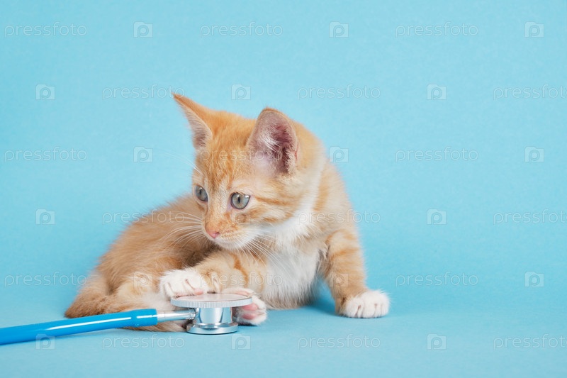 Симпатичный рыжий котенок играет со стетоскопом на синем фоне