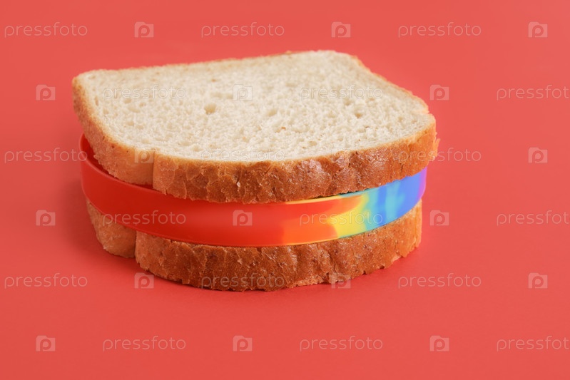 Бутерброд с игрушкой антистресс, вместо начинки, красный фон, комический арт
