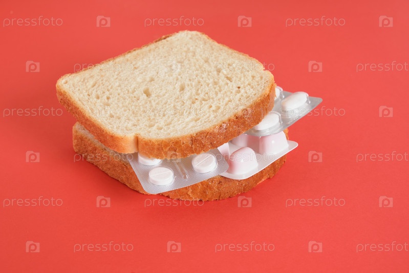 Бутерброд с упаковками таблеток вместо начинки, красный фон, концепция лечения