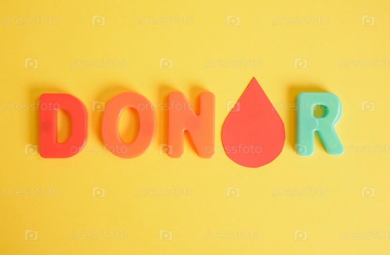 Капля крови из бумаги и надпись донор из пластиковых букв на желтом фоне, концепция Всемирного дня донора