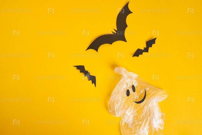 Призрак из целлофанового пакета и вырезанные из черной бумаги летучие мыши на желтом фоне