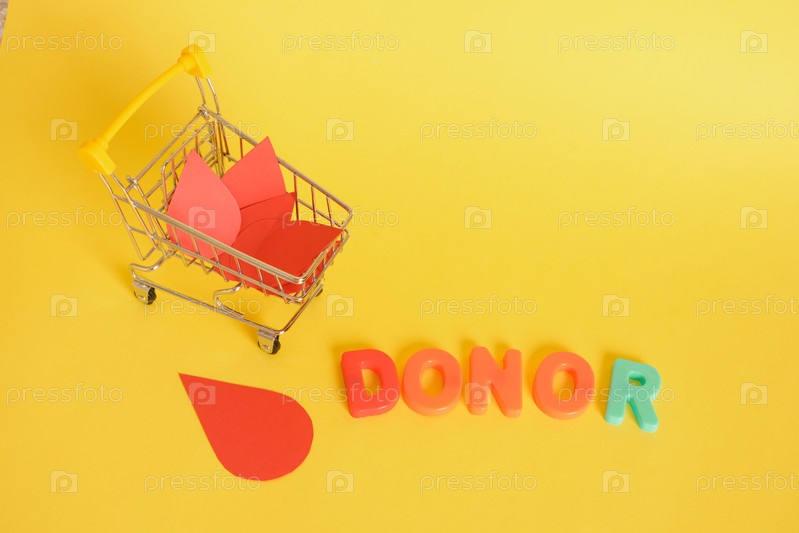Бумажные капли крови и корзина для покупок и надпись донор на желтом фоне, концепция Всемирного дня донора, сдача крови за деньги, банк донорской крови