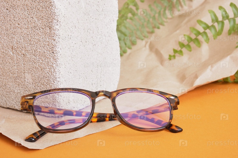 Очки на бетонном подиуме на коричневом фоне, трендовая композиция, стильные очки на бежевом фоне с растениями