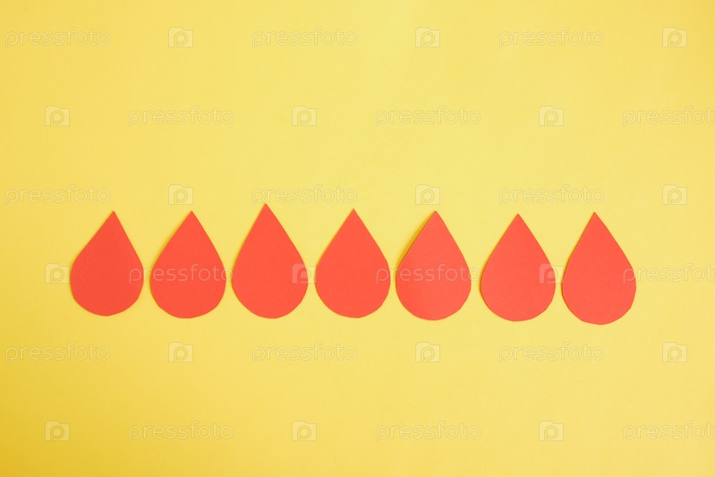 Бумажные капли крови на желтом фоне, концепция Всемирного дня донора, копия пространства, вид сверху