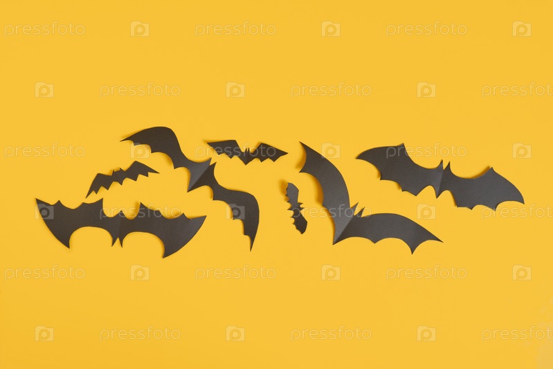 Летучие мыши, вырезанные из черной бумаги на оранжевом фоне, декор хэллоуина ручной работы, вид сверху, копия пространства