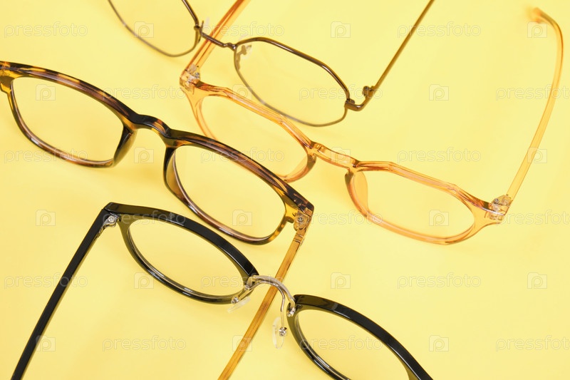 Много модных модных очков для коррекции зрения на желтом фоне