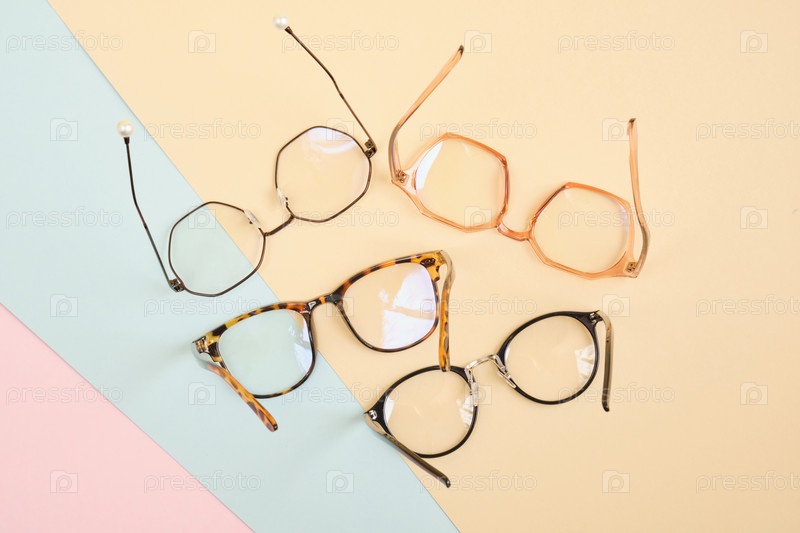 Несколько модных модных очков для коррекции зрения на красочном фоне, геометрическом фоне