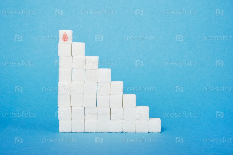 Кубик сахара с нарисованной каплей крови и лестницей сахара на синем фоне