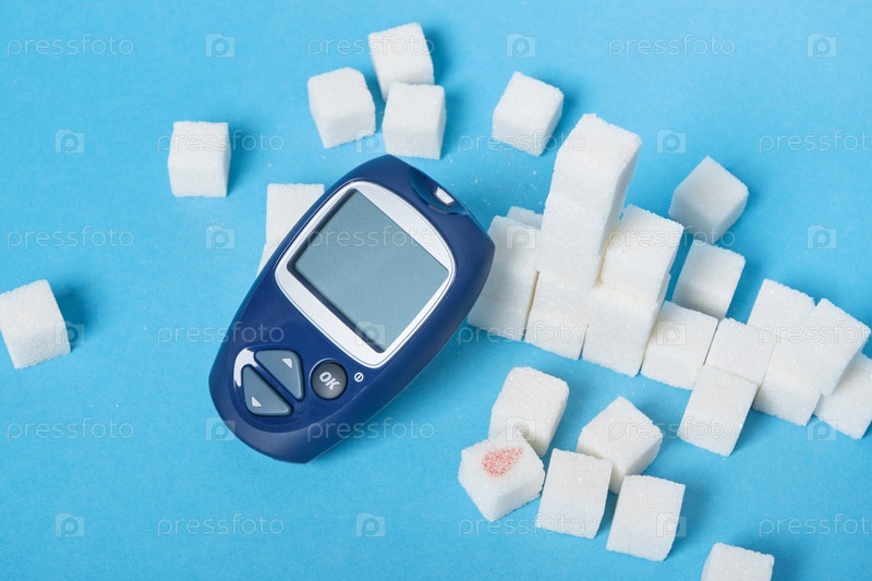 Устройство для измерения уровня глюкозы в крови и кубики сахара на синем фоне
