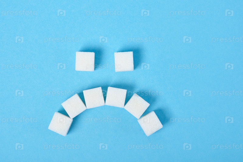Белые кубики сахара выложены в виде грустной улыбки на синем фоне крупным планом, пространство для копирования