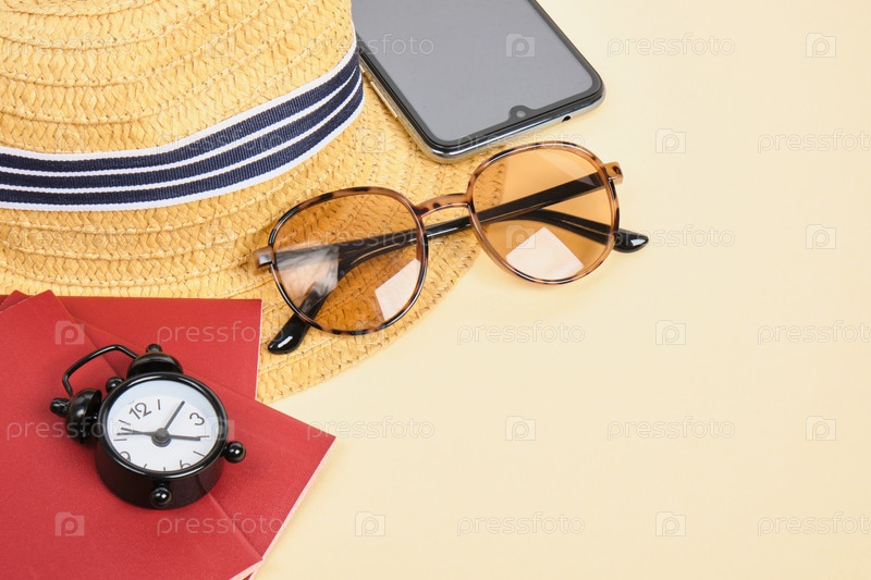Соломенная шляпа, солнцезащитные очки, будильник и паспорт на бежевом фоне, концепция путешествия и пляжного отдыха