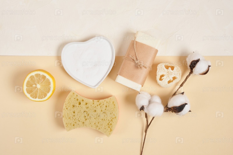Экологически чистый набор для чистки и ухода за телом, лимон, мыло, сода, мочалка, губка и цветок хлопка на бежевом фоне, концепция образа жизни без отходов
