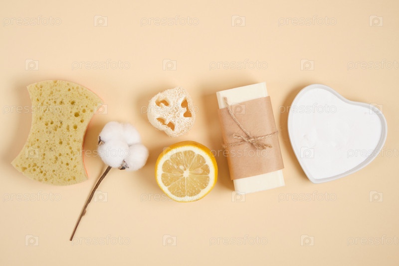 Экологически чистый набор для чистки и ухода за телом, лимон, мыло, сода, мочалка, губка и цветок хлопка на бежевом фоне, концепция образа жизни без отходов