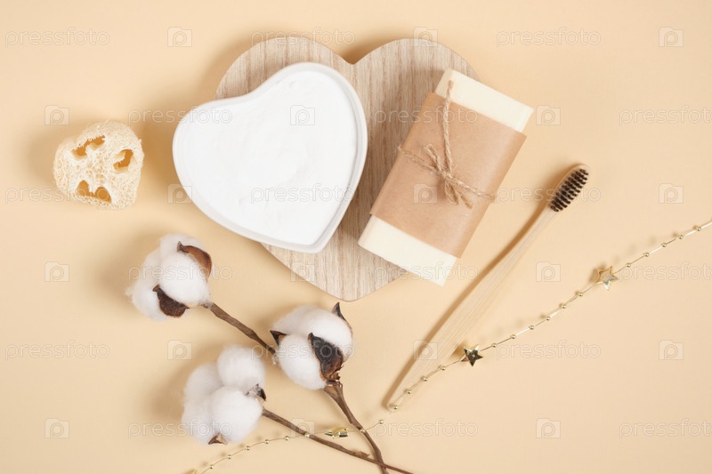 Экологически чистый набор для ухода за телом, мыло, сода, люфа и цветок хлопка на бежевом фоне, бамбуковая зубная щетка. концепция безотходного образа жизни