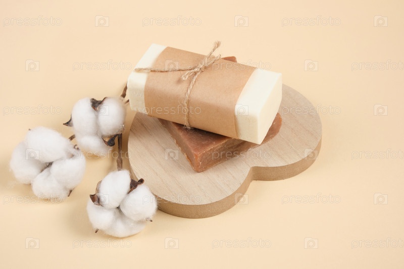 Два куска домашнего мыла ручной работы на деревянной подставке в форме сердца и бежевом фоне хлопкового цветка