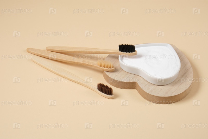 Экологически чистая бамбуковая зубная щетка. бамбуковые зубные щетки и пищевая сода на бежевом фоне