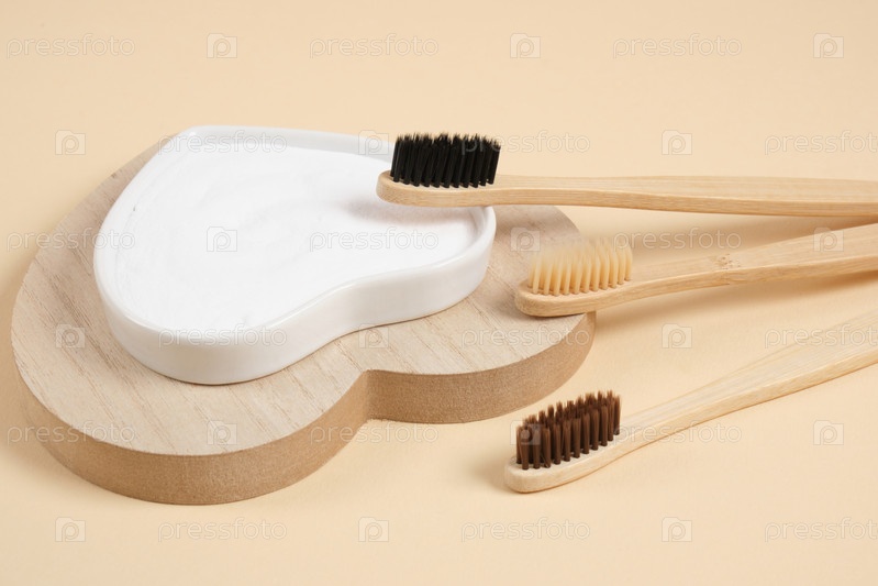 Экологически чистая бамбуковая зубная щетка. бамбуковые зубные щетки и пищевая сода на бежевом фоне
