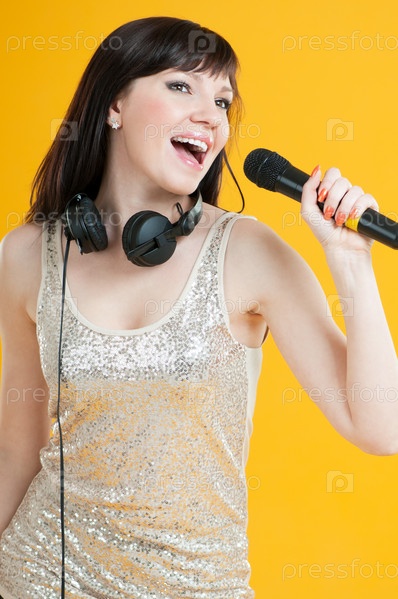 Беззаботная молодая женщина поет с микрофоном, студийная съемка