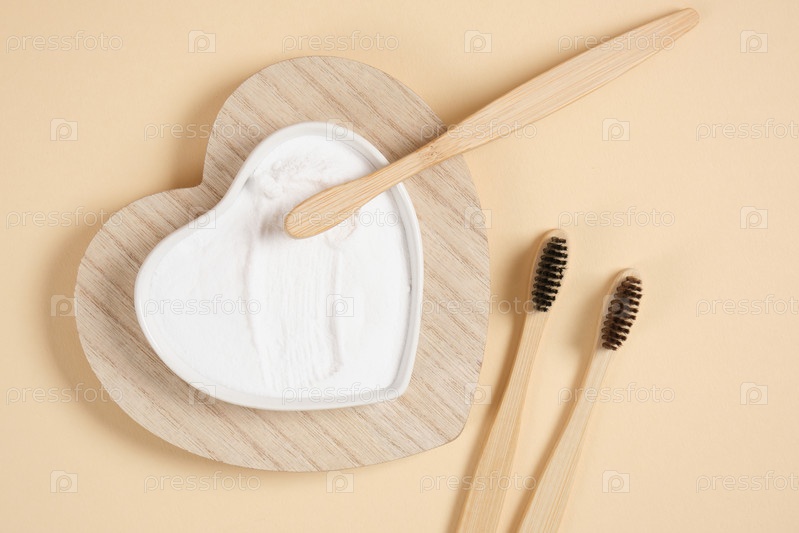 Экологически чистая бамбуковая зубная щетка. бамбуковые зубные щетки и пищевая сода на бежевом фоне