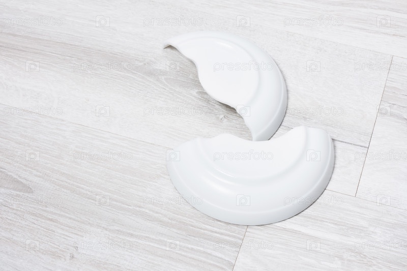 Сломанная белая тарелка на деревянном сером полу