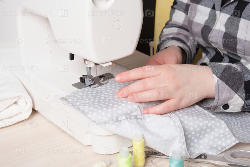 Женщина, работающая со швейной машиной, белая швейная машина на столе