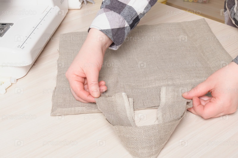 Женщина вырезает детали эко сумки, шоппер из натурального льна своими руками