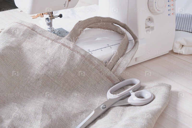 Процесс шитья эко-сумок, нитки, ножницы и швейная машинка на заднем плане