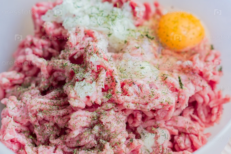 Фарш в миске с сырым яйцом, специями и нарезанным луком для приготовления котлет, выборочный фокус