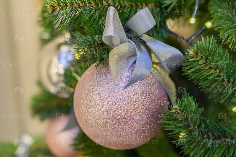Рождественские и новогодние праздники фон. Рождественская елка украшена розовым шаром. Концепция праздника