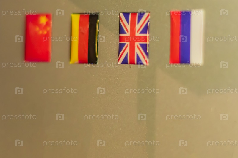 Китайские, немецкие, британские и российские флаги на золотой тарелке, выборочный фокус