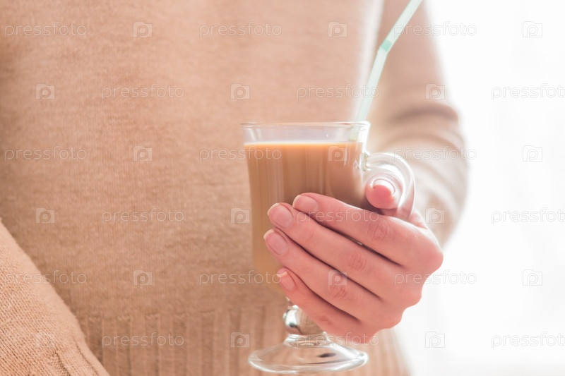 Женщина в бежевом свитере держит стеклянную чашку с кофе и синей соломинкой