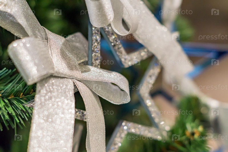 Рождественские и новогодние праздники фон. Рождественская елка украшена серебряным бантом и голубой звездой. Концепция праздника
