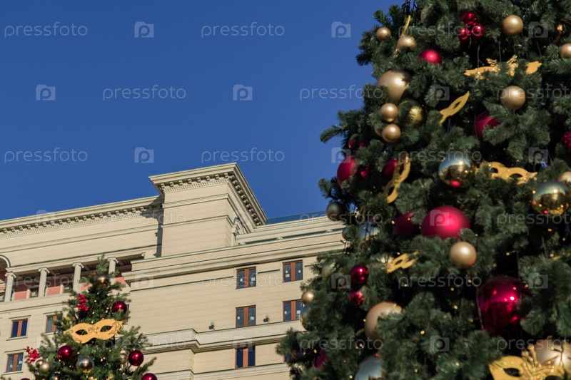 Новогоднее украшение города. Рождественские елки на улице украшены золотыми и красными шарами и гирляндами