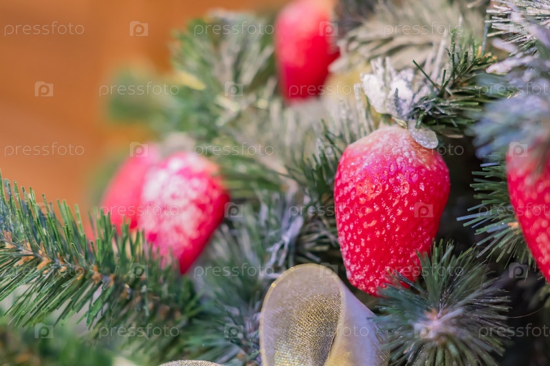Рождественские и новогодние праздники фон. Рождественская елка украшена клубникой, выборочный фокус. Концепция праздника