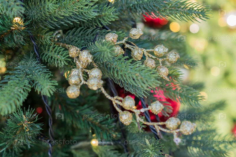 Закройте рождественскую елку, украшенную золотыми шариками. Новогодний фон
