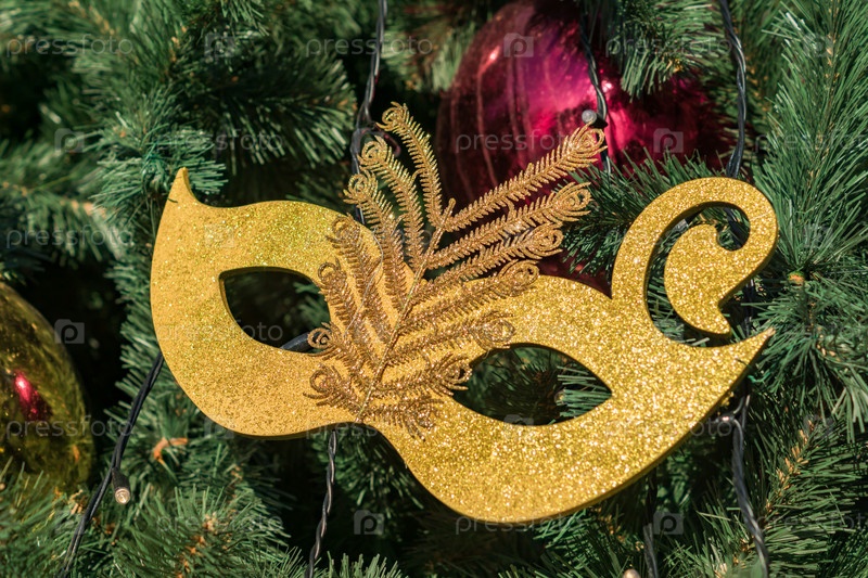 Рождественские и новогодние праздники фон. Рождественская елка украшена золотой маской, шарами и гирляндами