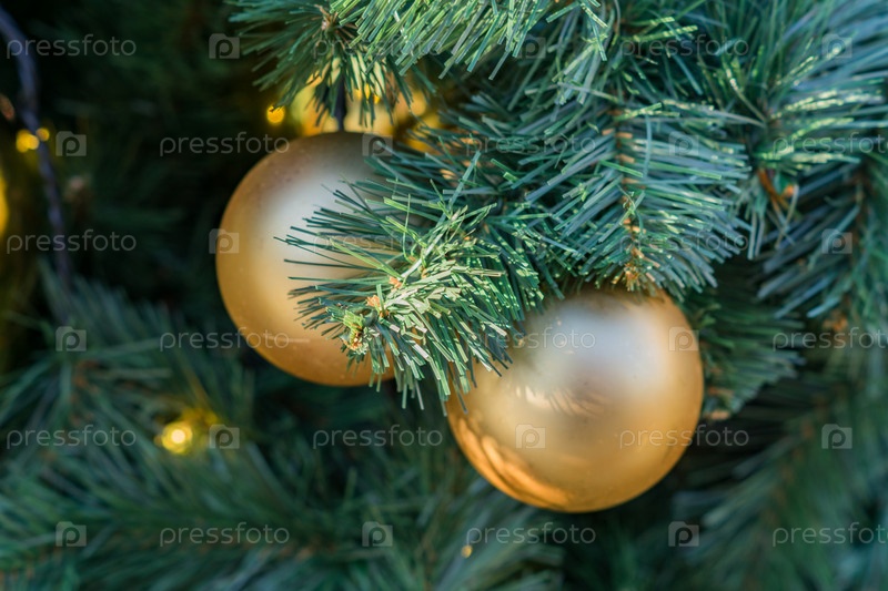 Рождественские и новогодние праздники фон. Рождественская елка украшена золотыми шарами. Концепция праздника