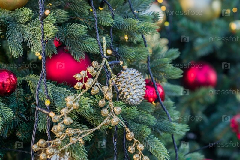 Закройте рождественскую елку, украшенную золотыми шариками. Новогодний фон