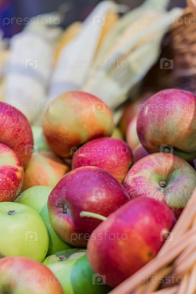 Красные спелые яблоки и кукурузные початки в корзине на фермерском рынке
